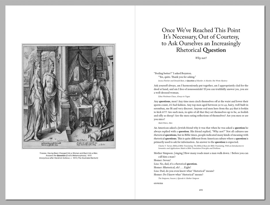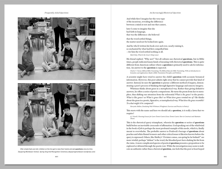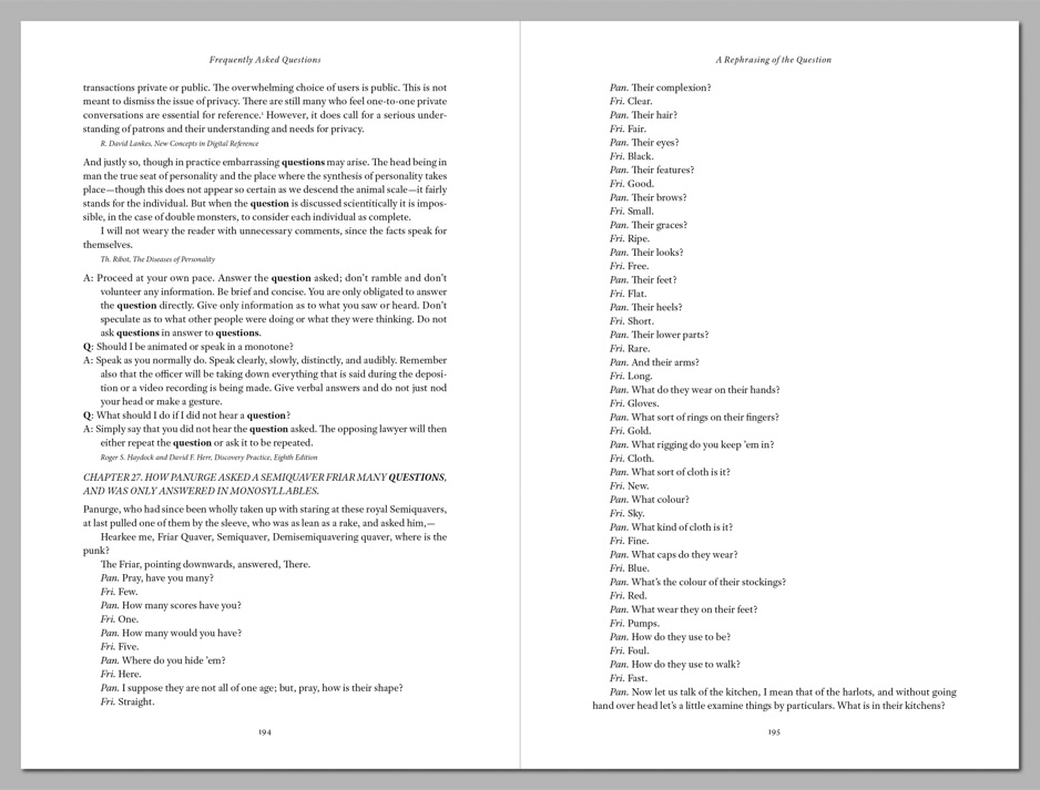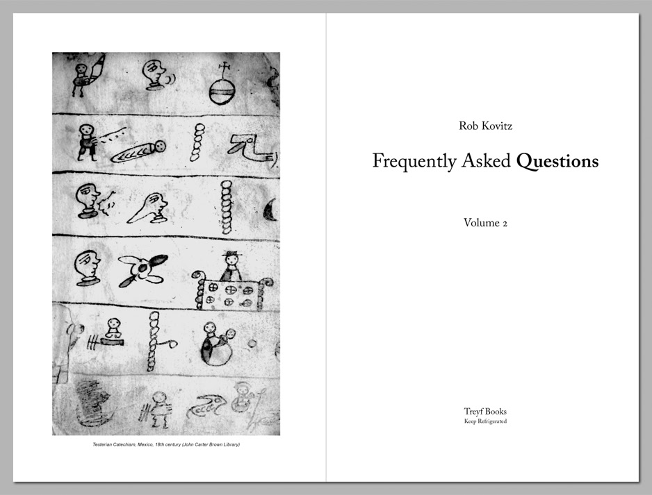 Rob Kovitz’s even more eagerly awaited supercut extravaganza, Frequently Asked Questions, Volume 2, is the continuation of his epistemological-ontological-metaphysical-montage-appropriation-detective-spy-mystery-thriller-courtroom procedure caper, in which every text selection includes the word question, but much funnier than that sounds (though not any shorter). In two volumes.