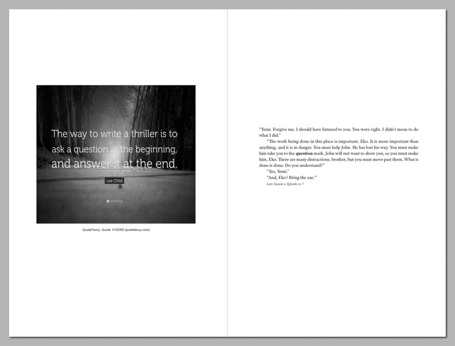 “The work being done in this place is important, Eko. It is more important than anything, and it is in danger. You must help John. He has lost his way. You must make him take you to the question mark. John will not want to show you, so you must make him, Eko. There are many distractions, brother, but you must move past them. What is done is done. Do you understand?”