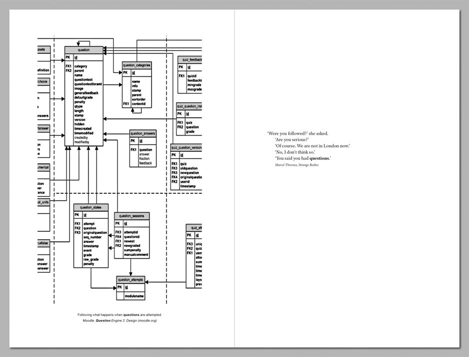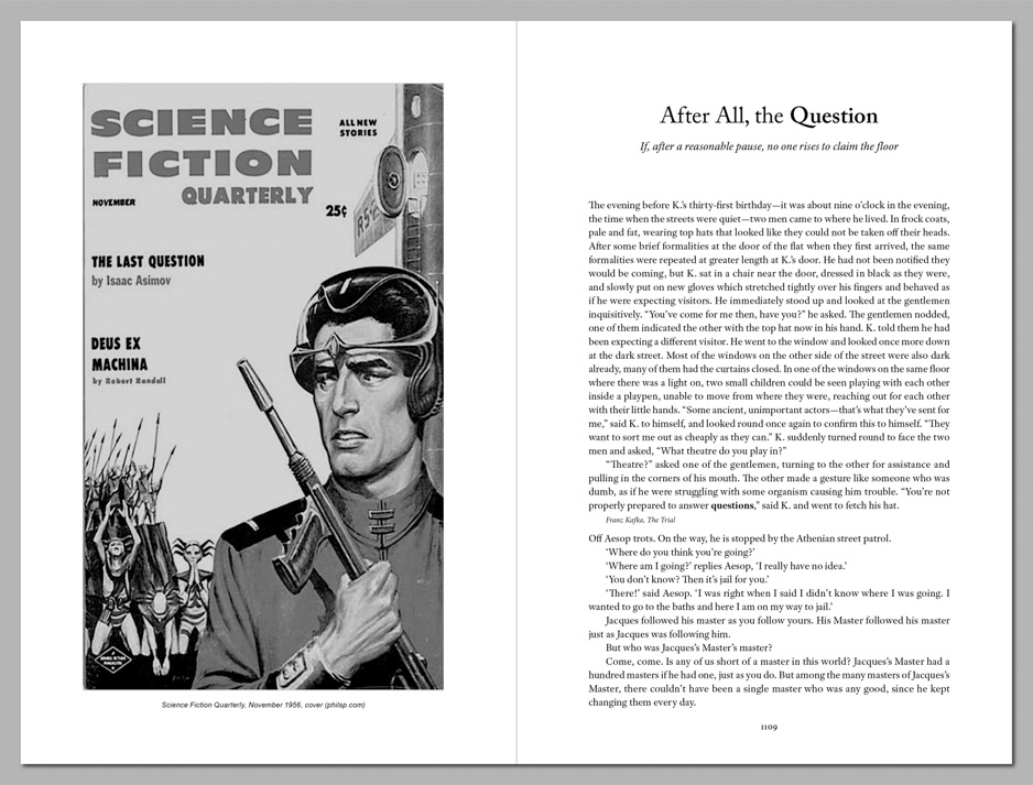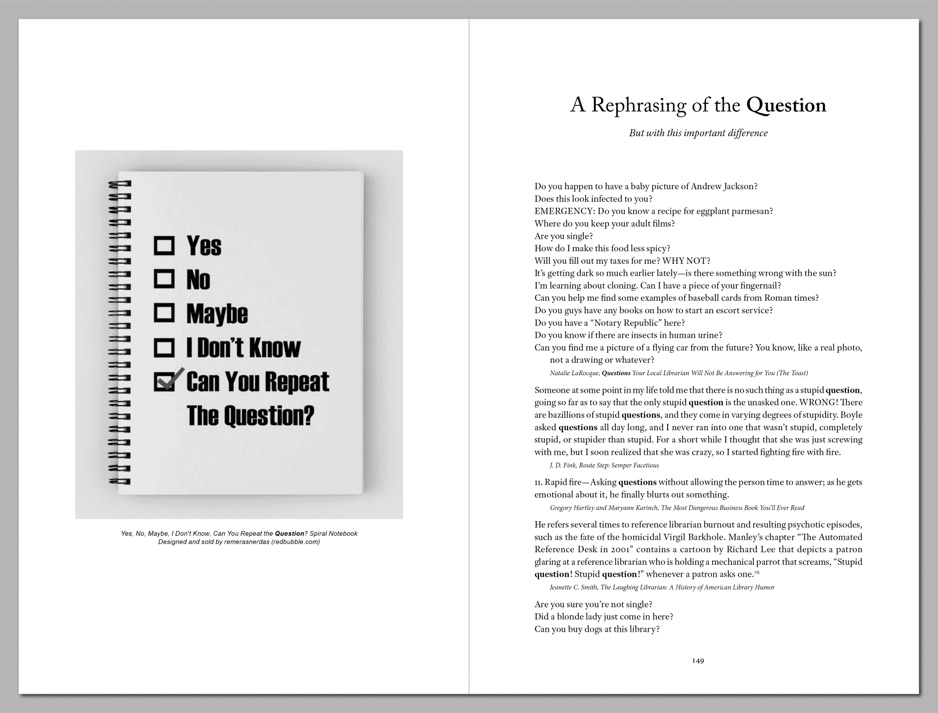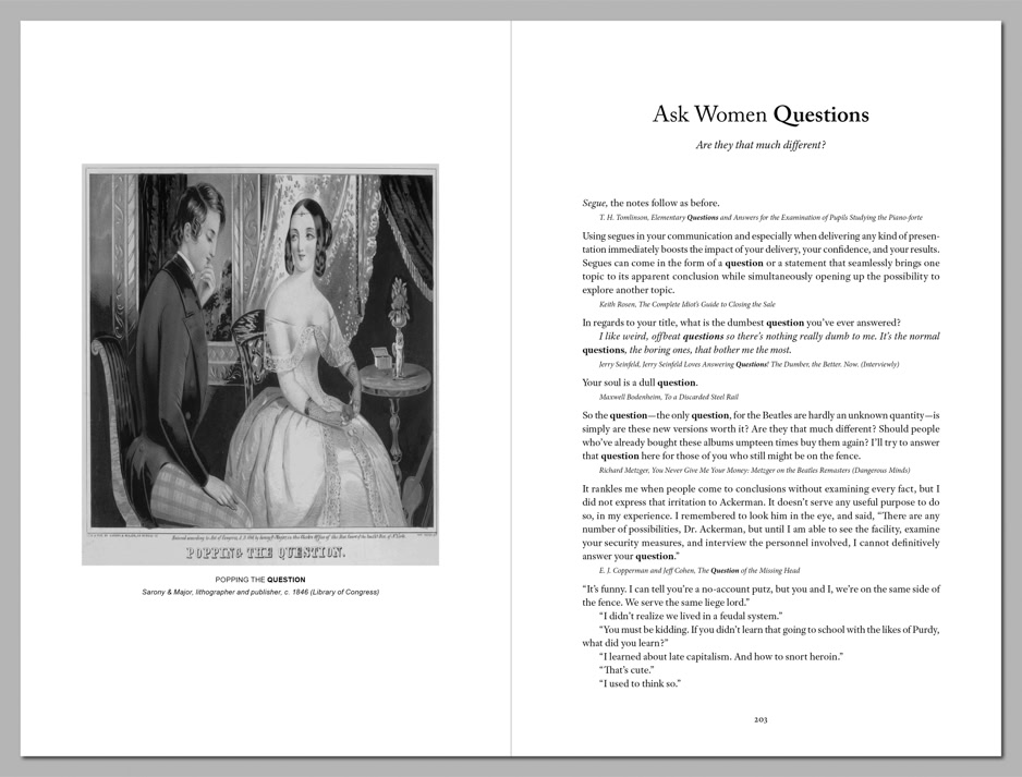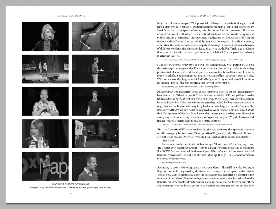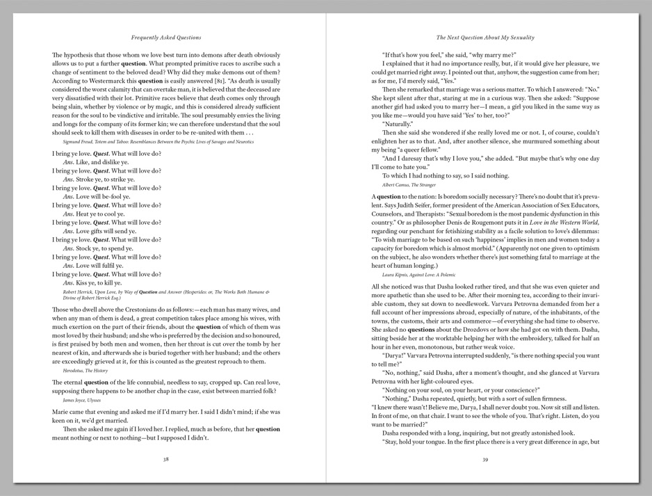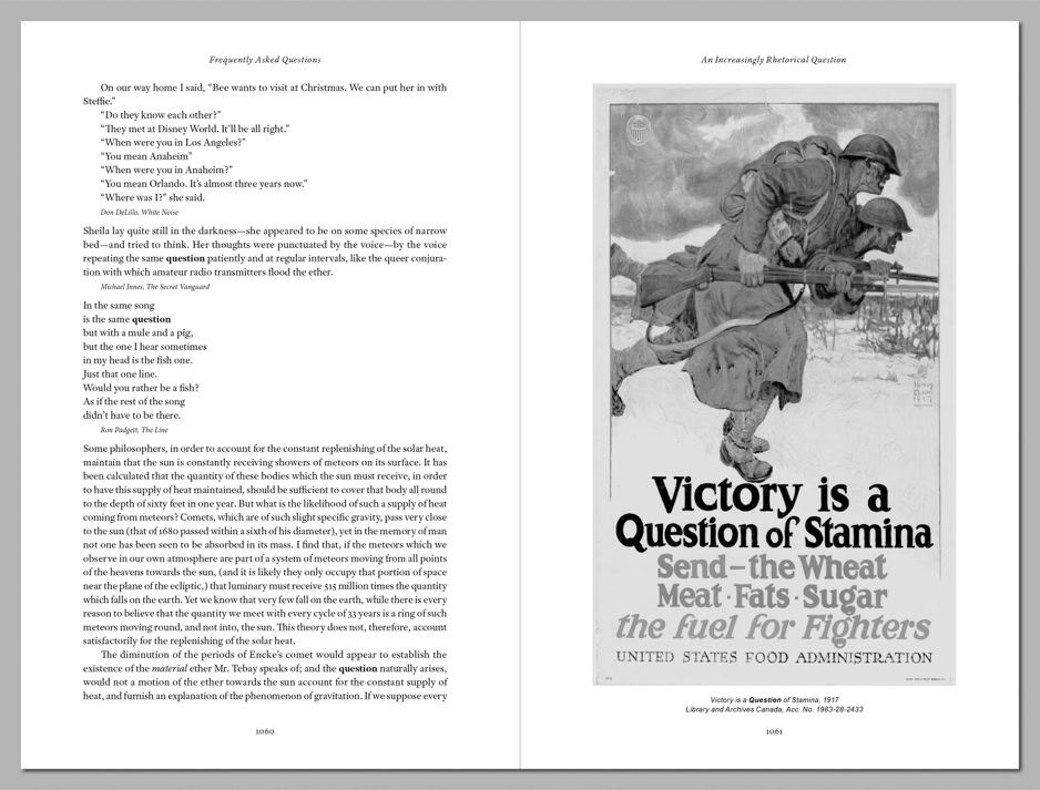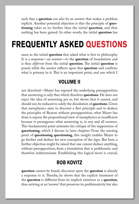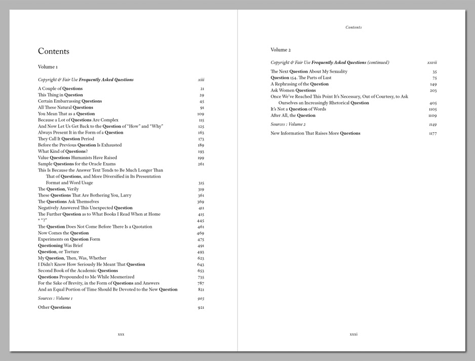 Rob Kovitz’s even more eagerly awaited supercut extravaganza, Frequently Asked Questions, Volume 2, is the continuation of his epistemological-ontological-metaphysical-montage-appropriation-detective-spy-mystery-thriller-courtroom procedure caper, in which every text selection includes the word question, but much funnier than that sounds (though not any shorter). In two volumes.