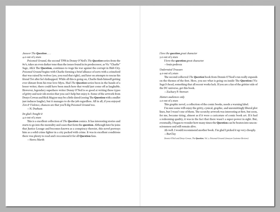 I’m sure some will enjoy the gritty, cynical, graphic, and unremittingly liberal plot lines, but I wasn’t one of them. The scratchy artwork was interesting at first, but soon, for me, became tiring, almost as if it were a caricature of comic book art. If it had a redeeming quality, it was in the fact that there wasn’t a super-power in sight. But, eventually, I began to wonder how many times the Question can be beaten into unconsciousness and still remain alive.